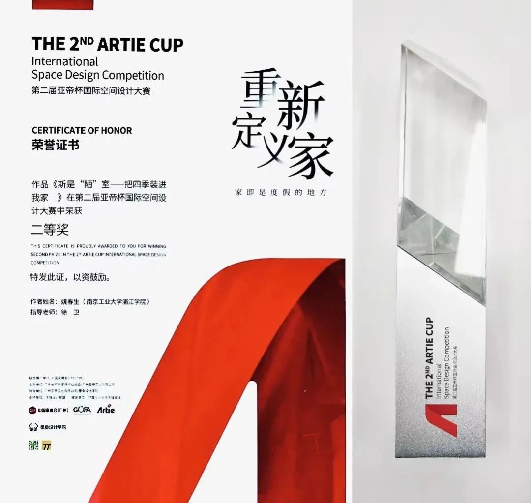 3月19日上午,在廣州保利世貿(mào)博覽館舉行的第二屆亞帝杯國際空間設(shè)計大賽頒獎典禮上。土木學(xué)院18建筑02班姚春生同學(xué)的作品《斯是“陋”室,把四季裝進(jìn)我家》(指導(dǎo)教師徐衛(wèi))以并列第二的成績,榮獲二等獎。