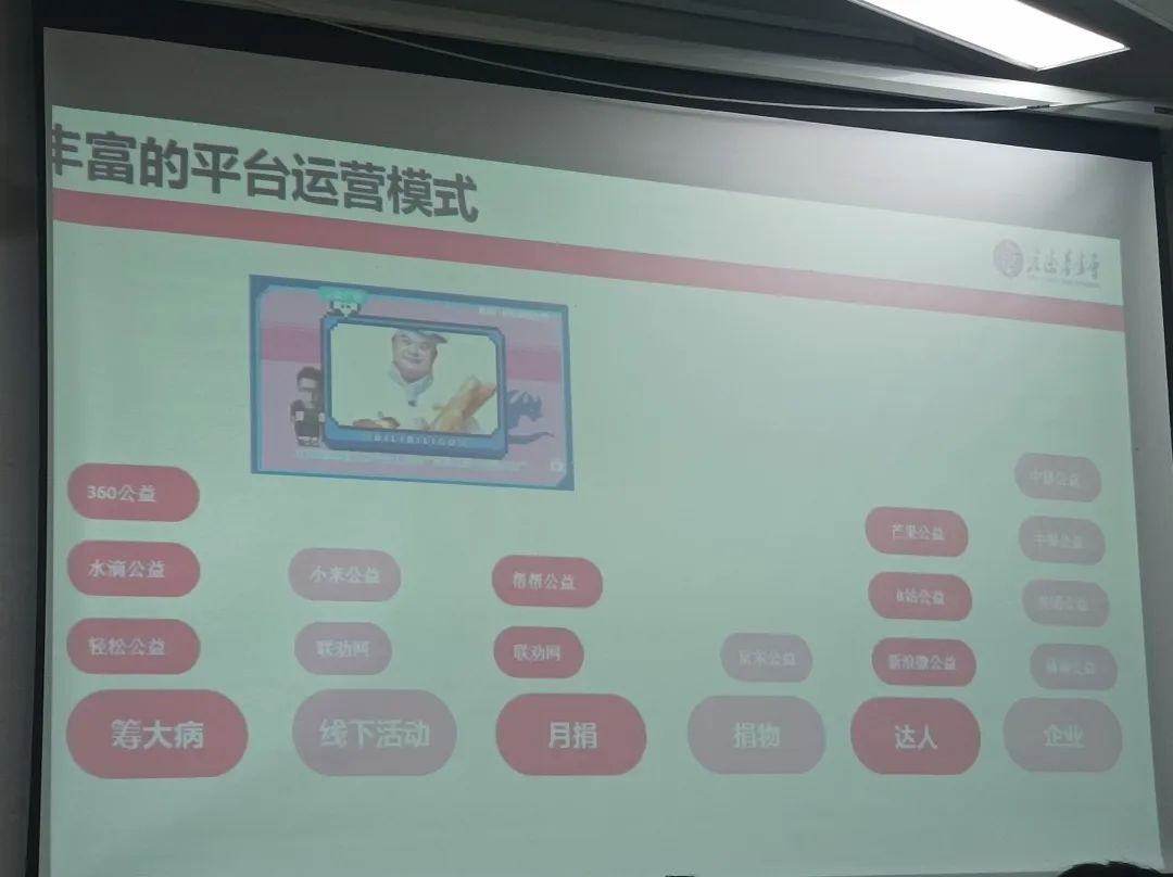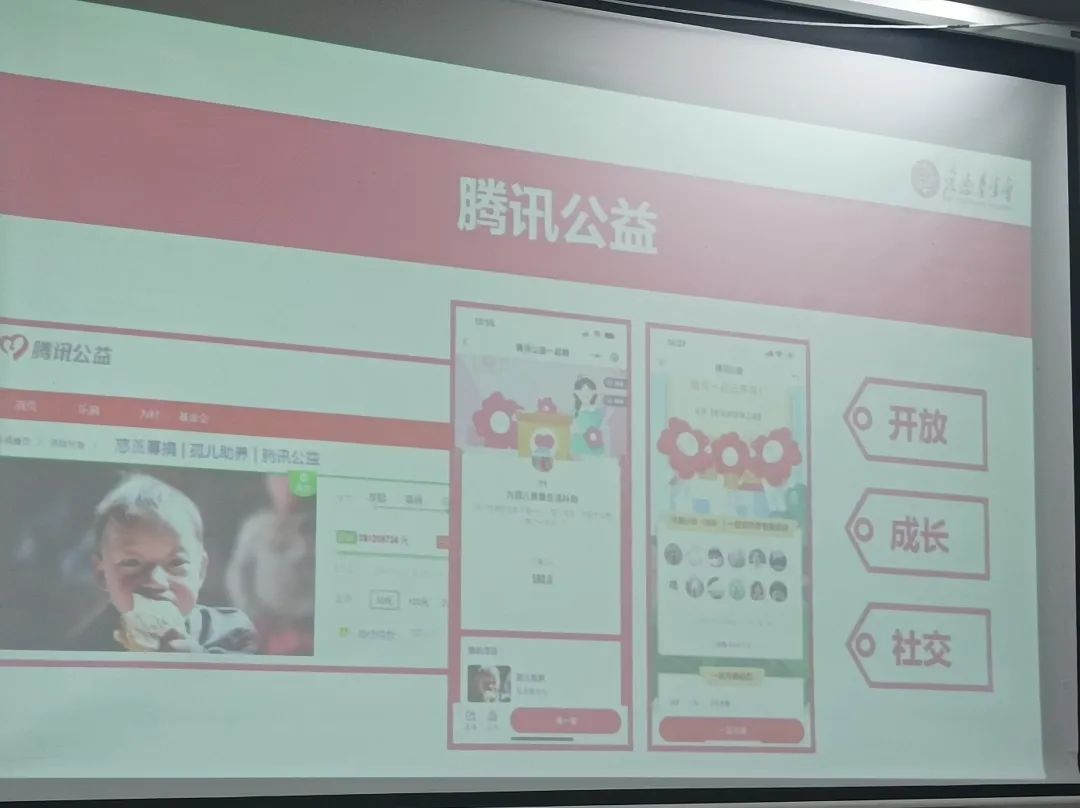 與此同時(shí),方峻先生以互聯(lián)網(wǎng)運(yùn)用為節(jié)點(diǎn),從用戶、渠道以及平臺(tái)的角度出發(fā)對早期公益事業(yè)的進(jìn)行與現(xiàn)今公益事業(yè)的發(fā)展做了有效對比,以現(xiàn)實(shí)案例與數(shù)據(jù)為證,以事實(shí)說話,使同學(xué)們更加直面的了解到了互聯(lián)網(wǎng)對于公益的影響。