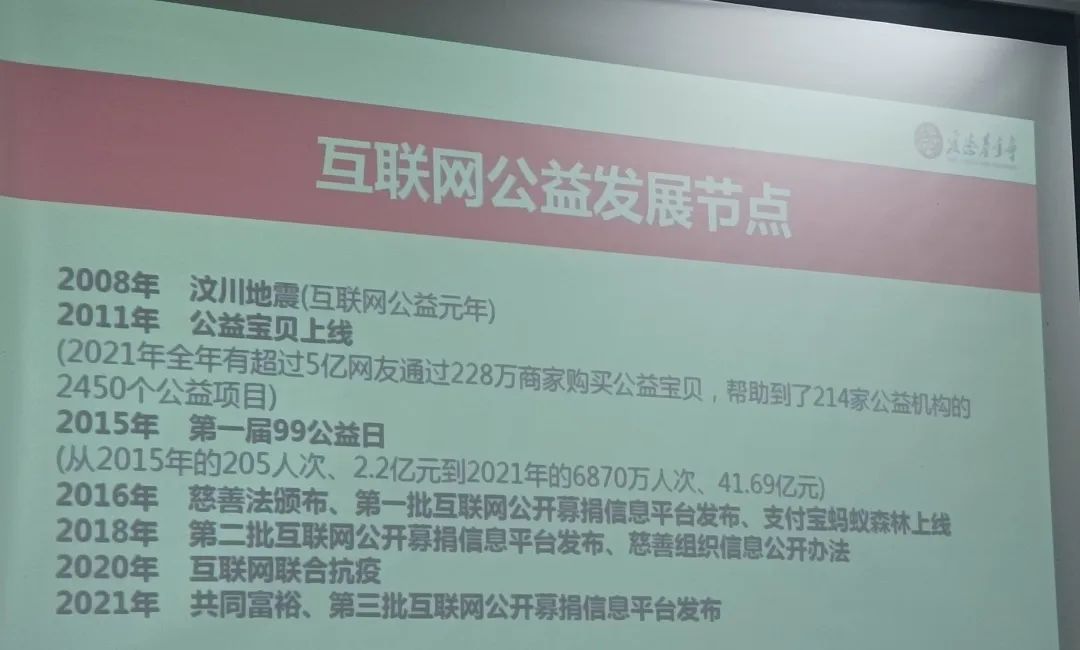 隨后,方先生以騰訊公益、支付寶公益、阿里公益以及字節(jié)公益為例對互聯(lián)網(wǎng)公益的平臺(tái)進(jìn)行了對比介紹,告訴同學(xué)們應(yīng)該如何開展互聯(lián)網(wǎng)公益、如何使自己的項(xiàng)目在互聯(lián)網(wǎng)平臺(tái)中脫穎而出。
