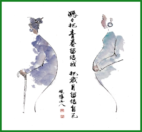 媽媽把青春留給我,把歲月留給自己。兩條曲線勾勒出女人的一生。此畫作者系南京工業(yè)大學浦江學院董事長李聞海先生。