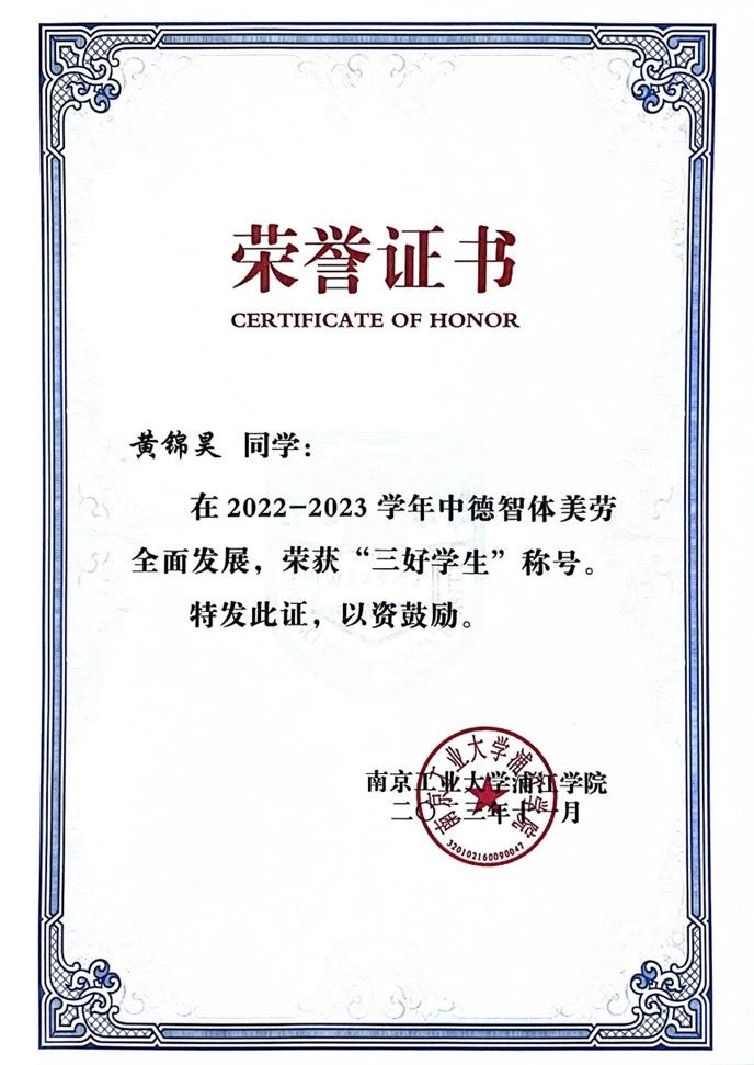 知物由學(xué),學(xué)習(xí)對(duì)青少年有著極為特殊的意義。習(xí)近平總書記強(qiáng)調(diào):“夢(mèng)想從學(xué)習(xí)開始,事業(yè)靠本領(lǐng)成就。廣大青年要自覺加強(qiáng)學(xué)習(xí),不斷增強(qiáng)本領(lǐng)”。自入學(xué)以來,黃錦昊認(rèn)真學(xué)習(xí)專業(yè)知識(shí),努力提高專業(yè)水平和實(shí)踐能力,綜合績(jī)點(diǎn)連續(xù)兩年位列專業(yè)前4%。曾榮獲2021-2022學(xué)年優(yōu)秀學(xué)業(yè)獎(jiǎng)學(xué)金二等獎(jiǎng)、2022-2023學(xué)年優(yōu)秀學(xué)業(yè)獎(jiǎng)學(xué)金二等獎(jiǎng);并連續(xù)兩年榮獲校“三好學(xué)生”的稱號(hào)。