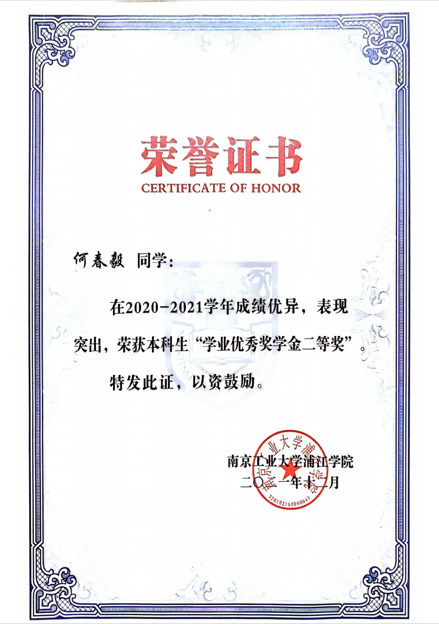 2021年12月 學(xué)業(yè)優(yōu)秀獎(jiǎng)學(xué)金二等獎(jiǎng);