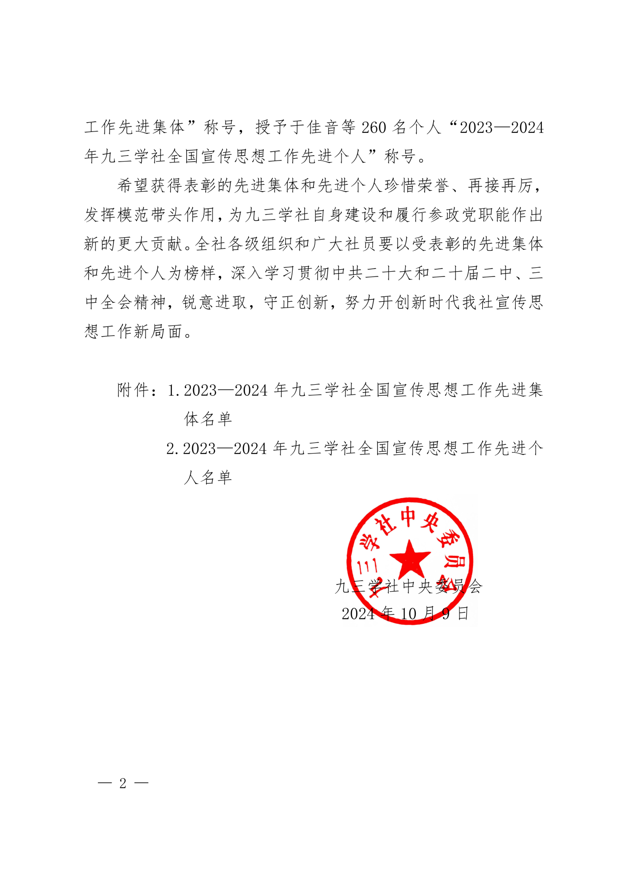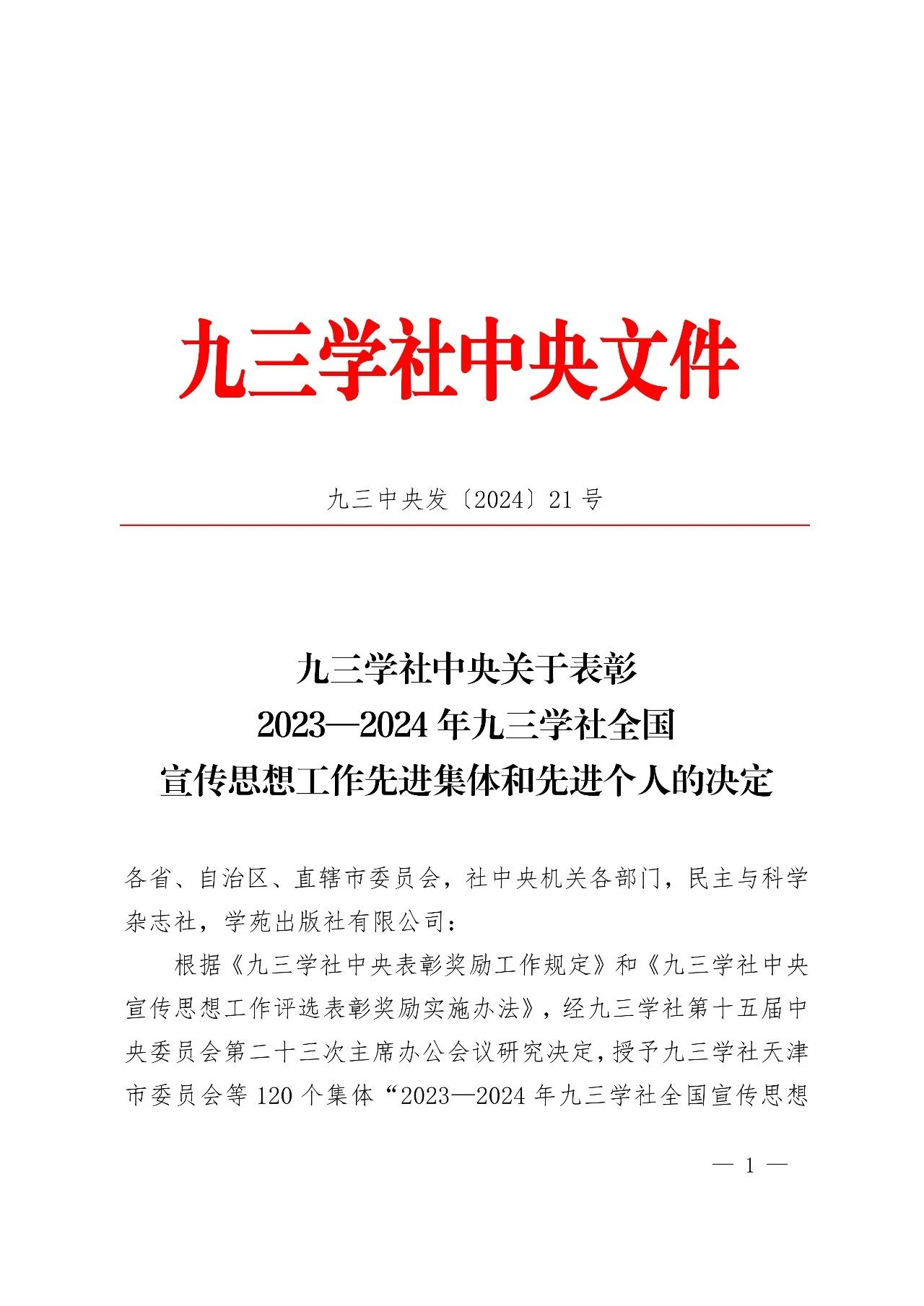 10月9日,根據(jù)《九三學社中央表彰獎勵工作規(guī)定》和《九三學社中央宣傳思想工作評選表彰獎勵實施辦法》,經(jīng)九三學社第十五屆中央委員會第二十三次主席辦公會議研究和討論,決定授予120個集體“2023—2024年九三學社全國宣傳思想工作先進集體”稱號、260名個人“2023—2024年九三學社全國宣傳思想工作先進個人”稱號。