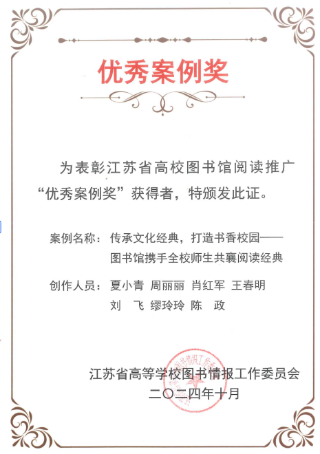 頂 薦 熱 我校圖書館榮獲2024年江蘇省高校圖書館閱讀推廣“優(yōu)秀案例”獎(jiǎng)