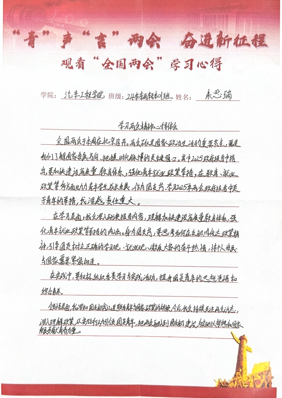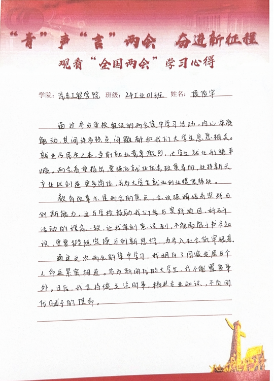 15經(jīng)過(guò)對(duì)本次十四屆全國(guó)人大第三次會(huì)議開(kāi)幕式的學(xué)習(xí),我作為汽車服務(wù)工程專業(yè)的一名學(xué)生,內(nèi)心充滿了對(duì)未來(lái)的憧憬與奮斗的動(dòng)力。兩會(huì)強(qiáng)調(diào)了科技創(chuàng)新和綠色發(fā)展,特別是新能源汽車和智能網(wǎng)聯(lián)技術(shù)這兩方面,讓我看到了汽車行業(yè)的廣闊前景。我深知,要想在這個(gè)領(lǐng)域有所作為,必須不斷學(xué)習(xí)新知識(shí)、新技術(shù)。因此,我計(jì)劃在未來(lái)的學(xué)習(xí)中,我將會(huì)更加注重實(shí)踐操作和創(chuàng)新能力培養(yǎng)。我會(huì)積極參與學(xué)校提供的實(shí)驗(yàn)、實(shí)訓(xùn)機(jī)會(huì),通過(guò)實(shí)際操作加深對(duì)專業(yè)知識(shí)的理解。同時(shí),我也會(huì)主動(dòng)關(guān)注行業(yè)動(dòng)態(tài),了解最新技術(shù)發(fā)展趨勢(shì),為將來(lái)的職業(yè)發(fā)展打下堅(jiān)實(shí)基礎(chǔ)。作為一名共產(chǎn)黨員,我將以兩會(huì)精神為指引,努力成為對(duì)社會(huì)有用的汽車專業(yè)人才,為推動(dòng)汽車行業(yè)高質(zhì)量發(fā)展和實(shí)現(xiàn)中國(guó)汽車強(qiáng)國(guó)夢(mèng)貢獻(xiàn)自己的力量。總之,兩會(huì)為我們汽車學(xué)子提供了寶貴的指引和動(dòng)力,讓我們更加堅(jiān)定了為汽車事業(yè)接續(xù)奮斗的決心。——24汽車轉(zhuǎn)本01班 嚴(yán)欣悅