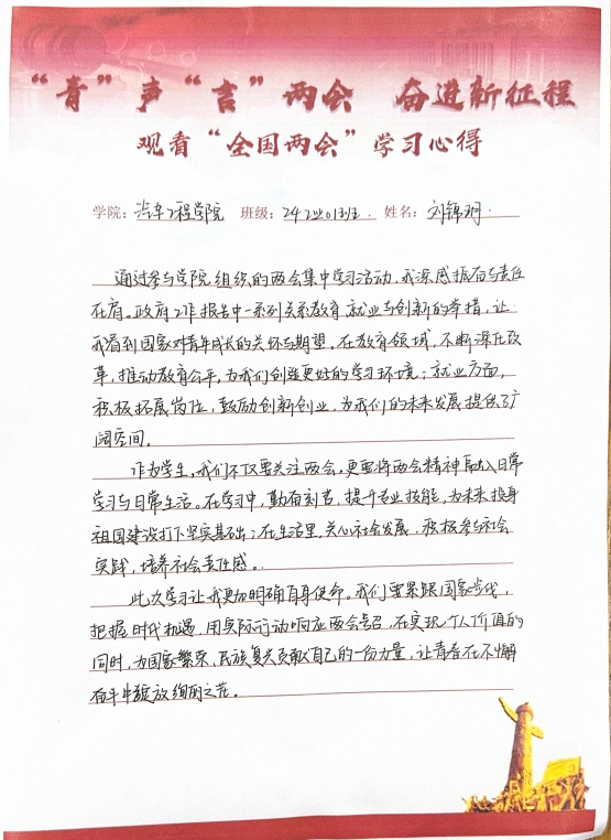 6從“兩會(huì)”聚焦的科技創(chuàng)新與產(chǎn)業(yè)發(fā)展,我深刻認(rèn)識(shí)到汽車產(chǎn)業(yè)轉(zhuǎn)型升級(jí)的關(guān)鍵時(shí)期,新能源與智能網(wǎng)聯(lián)汽車發(fā)展帶來(lái)機(jī)遇和挑戰(zhàn),學(xué)院實(shí)踐平臺(tái)與科研項(xiàng)目讓我們深知科技創(chuàng)新重要性,決心緊跟行業(yè)趨勢(shì),夯實(shí)知識(shí)、提升能力、培養(yǎng)思維,投身技術(shù)研發(fā)與系統(tǒng)優(yōu)化助力產(chǎn)業(yè)進(jìn)步。同時(shí),兩會(huì)精神對(duì)職業(yè)教育和人才培養(yǎng)也意義重大,作為一名汽車服務(wù)工程專業(yè)的青年學(xué)生,我將會(huì)持續(xù)提升創(chuàng)新意識(shí),努力成為優(yōu)秀汽車專業(yè)人才。我堅(jiān)信,青年心懷理想,腳踏實(shí)地才能在民族復(fù)興征程書(shū)寫青春篇章,期待我國(guó)汽車產(chǎn)業(yè)在科技創(chuàng)新驅(qū)動(dòng)下不斷壯大,實(shí)現(xiàn)汽車強(qiáng)國(guó)夢(mèng)。——21汽車01班 齊文釗