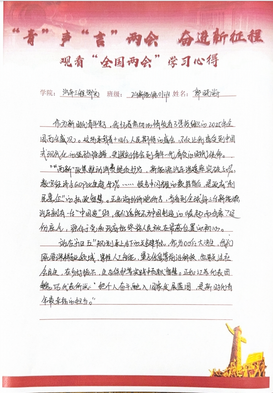 9春潮涌動(dòng)處,恰是奮進(jìn)時(shí)。隨著我國(guó)科學(xué)技術(shù)飛速發(fā)展、人工智能領(lǐng)域取得巨大突破,新能源汽車產(chǎn)業(yè)發(fā)展更是日新月異。身為汽院學(xué)子,我們當(dāng)以“操千曲而后曉聲”的篤學(xué),掌握好專業(yè)知識(shí);更需以“觀千劍而后識(shí)器”的實(shí)踐觀念拓展渠道了解更多車輛發(fā)展信息,多多參與科技競(jìng)賽活動(dòng),提高見(jiàn)識(shí)與創(chuàng)新能力。將科技、智能與技術(shù)融于一身,助力自身多方位發(fā)展,將兩會(huì)精神內(nèi)化于心、外化于行。愿我們以紅色精神為帆,以創(chuàng)新智慧為槳,在星辰大海的征途中,共譜中國(guó)式現(xiàn)代化的壯麗詩(shī)篇! ——23車輛01班 姚仕野