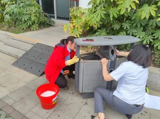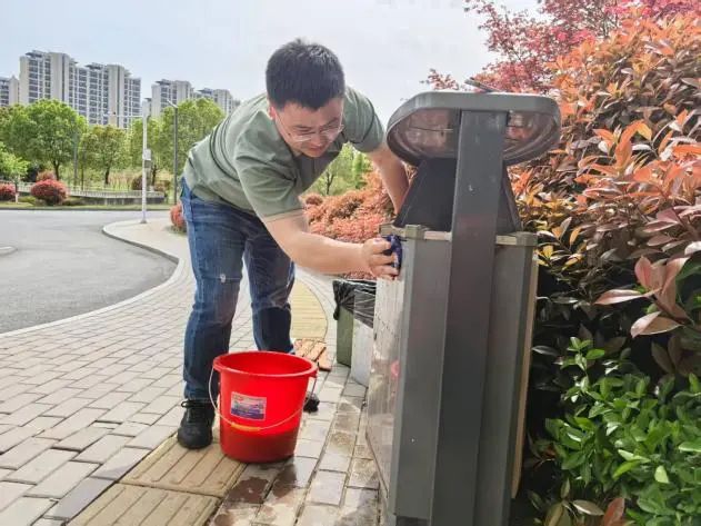 在具體的改造過程中,房管科朱斌等同志展現(xiàn)出高度的專業(yè)素養(yǎng)與敬業(yè)精神。他們在拆除老化損壞的部件后,對垃圾桶進(jìn)行深度清潔,為延長垃圾桶的使用壽命,還進(jìn)行了細(xì)致的防銹處理;最后,貼上具有防水特性的垃圾分類標(biāo)識貼膜,不僅在外觀上實現(xiàn)了美化,更是通過標(biāo)準(zhǔn)化的分類標(biāo)識,讓垃圾分類工作更加規(guī)范、高效,極大地提升了垃圾桶的環(huán)保效能,實現(xiàn)了功能的全面升級。