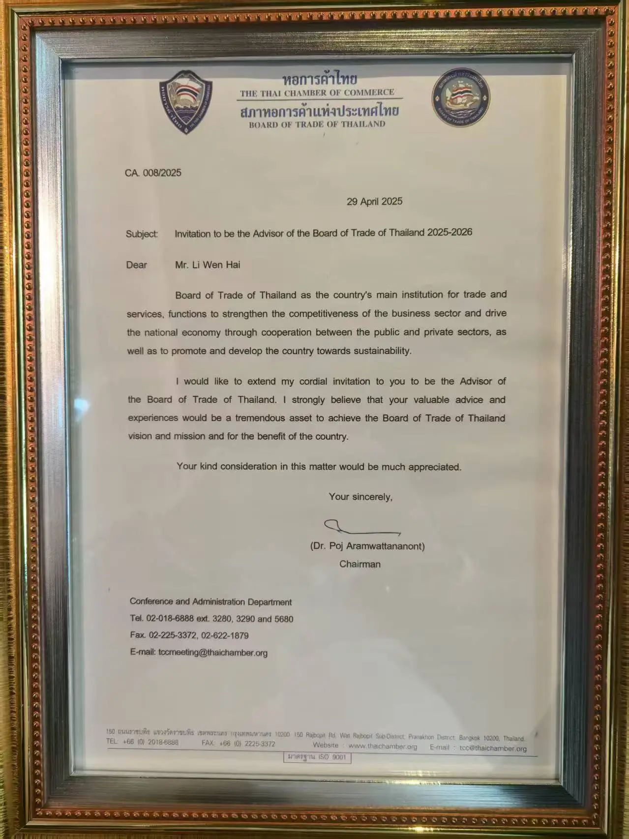 此次聘任李聞海先生為泰國(guó)貿(mào)易院海外顧問(wèn),是泰國(guó)政府對(duì)他在中泰交流領(lǐng)域突出貢獻(xiàn)的認(rèn)可。李聞海將在貿(mào)易合作上進(jìn)一步助力兩國(guó)企業(yè)對(duì)接,挖掘互利機(jī)遇。同時(shí),在教育聯(lián)動(dòng)中,他將以高等院校為平臺(tái)深化中泰學(xué)術(shù)與人才培養(yǎng)交流;在文化交流中,他將促進(jìn)兩國(guó)文化互鑒,增進(jìn)民間友好。長(zhǎng)期以來(lái),李聞海以務(wù)實(shí)行動(dòng)深耕中泰友誼,此次受聘泰國(guó)貿(mào)易院海外顧問(wèn),不僅是對(duì)他個(gè)人的充分肯定,更是中泰親密合作的重要象征。