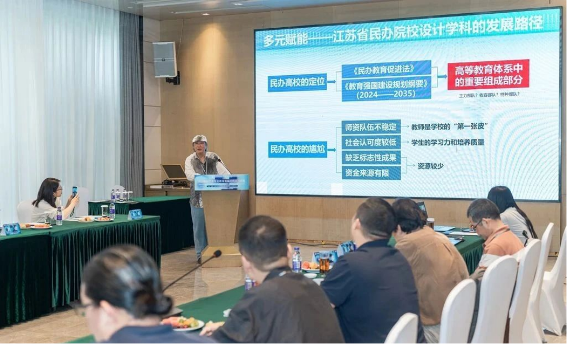論壇邀請江蘇省工業(yè)設(shè)計學(xué)會理事長、南京藝術(shù)學(xué)院原副校長何曉佑教授在開幕式致辭并作題為"多元賦能-民辦院校設(shè)計學(xué)科的發(fā)展路徑"的主旨報告。他在報告中強(qiáng)調(diào),隨著《民辦教育促進(jìn)法》和《教育強(qiáng)國建設(shè)規(guī)劃綱要(2024-2035)》的相繼出臺,民辦教育在高等教育體系中的地位得到進(jìn)一步明確,提出民辦高校藝術(shù)設(shè)計專業(yè)應(yīng)當(dāng)立足自身特色,從六個維度探索差異化發(fā)展道路。同時表示支持推動成立民辦院校設(shè)計教育聯(lián)盟。