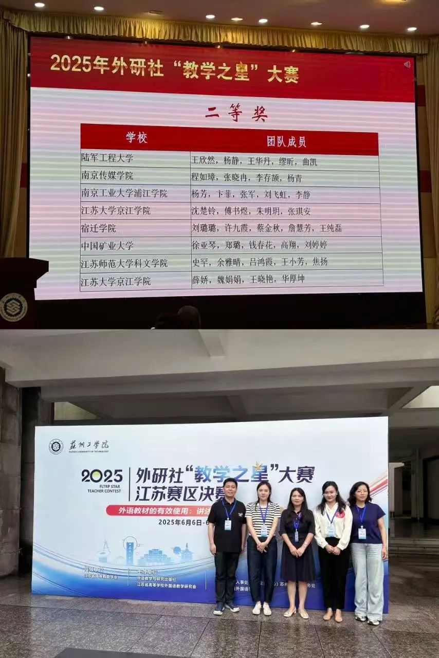 在6月7至8日舉行的2025年外研社“教學(xué)之星”大賽江蘇省決賽中,我校基礎(chǔ)教學(xué)部大學(xué)英語(yǔ)教研室楊芳、卞菲、張軍、劉飛虹、李靜教師團(tuán)隊(duì)經(jīng)過(guò)數(shù)月的精心設(shè)計(jì)、認(rèn)真準(zhǔn)備、反復(fù)打磨,憑借扎實(shí)的教學(xué)功底與創(chuàng)新的教學(xué)理念,在40支參賽隊(duì)伍中脫穎而出,斬獲大學(xué)英語(yǔ)組二等獎(jiǎng)。此次比賽共分為教學(xué)方案設(shè)計(jì)、說(shuō)課、示范教學(xué)和專(zhuān)家提問(wèn)等四個(gè)環(huán)節(jié)。備賽期間學(xué)校和基礎(chǔ)教學(xué)部領(lǐng)導(dǎo)給予了大力支持與悉心指導(dǎo),大學(xué)英語(yǔ)教研室老師也對(duì)比賽方案和教學(xué)呈現(xiàn)提出了許多寶貴意見(jiàn)。